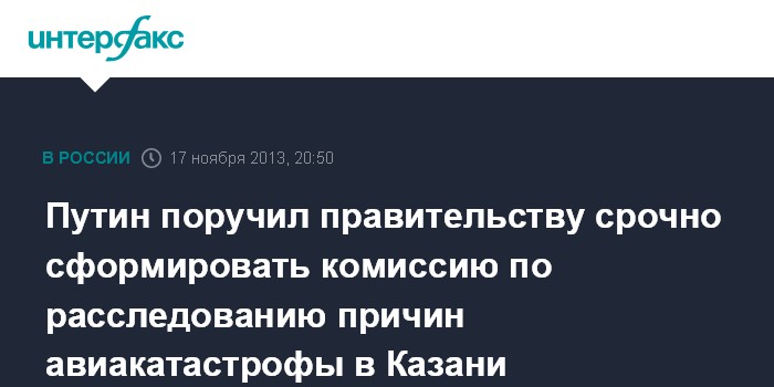 Москва. 17 ноября. INTERFAX.RU - Президент России Владимир Путин поручил правительству срочно сформировать комиссию по расследованию причин авиакатастрофы в Казани.