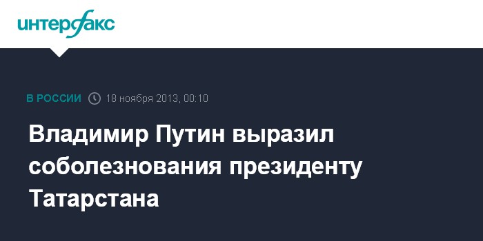 Москва. 18 ноября. INTERFAX.RU - Президент РФ Владимир Путин поговорил по телефону с президентом Татарстана Рустамом Миннихановым, сын которого находился на борту разбившегося в Казани самолета.