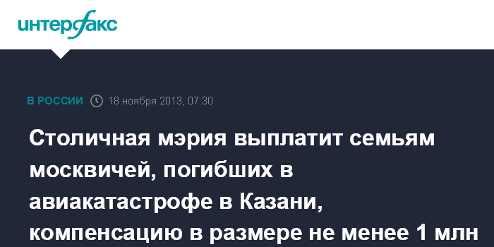 Москва. 18 ноября. ИНТЕРФАКС-МОСКВА - Семьи москвичей, погибших в результате авиакатастрофы в Казани в минувшее воскресенье, получат от правительства Москвы компенсации в размере не менее 1 млн рублей, сообщил "Интерфаксу" источник в городской администрации в понедельник.