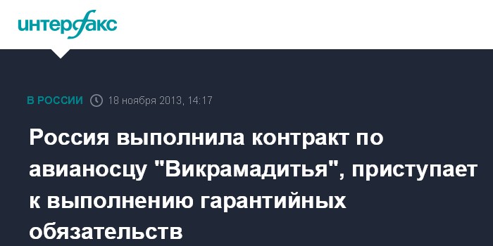 Северодвинск. 18 ноября. INTERFAX.RU - Контракт по модернизации авианосца "Викрамадитья" выполнен полностью, Россия приступает к выполнению гарантийных и постгарантийных обязательств по обслуживанию корабля, заявил журналистам в субботу заместитель генерального директора ОАО "Рособоронэкспорт" Игорь Севастьянов.
