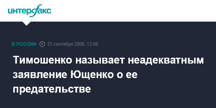 Киев. 21 сентября. INTERFAX.RU - Премьер-министр Украины Юлия Тимошенко считает неадекватным заявление президента Виктора Ющенко о ее предательстве.
