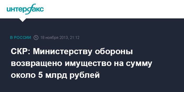 Москва. 18 ноября. INTERFAX.RU - Имущество на сумму около 5 млрд рублей было возвращено министерству обороны РФ в ходе расследования хищений в ОАО "Оборонсервис".