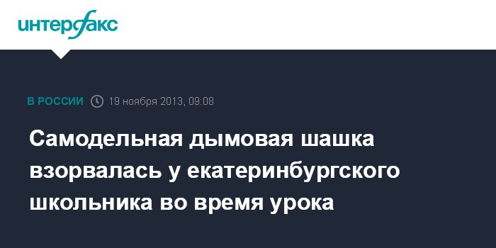 Екатеринбург. 19 ноября. INTERFAX.RU - Взрыв самодельной дымовой шашки произошел на уроке в школе № 77 в Екатеринбурге, сообщает пресс-служба ГУ МВД РФ по Свердловской области.