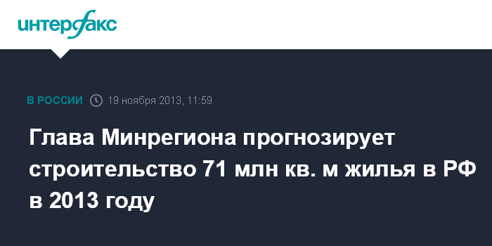 Москва. 19 ноября. INTERFAX.RU - В 2013 г. на территории России планируется построить 71 млн кв. м жилья, что значительно превышает показатели 2012 г., когда было введено в эксплуатацию 65,2 млн кв. м, заявил на ежегодной всероссийской строительной ассамблее в Москве министр регионального развития РФ Игорь Слюняев.