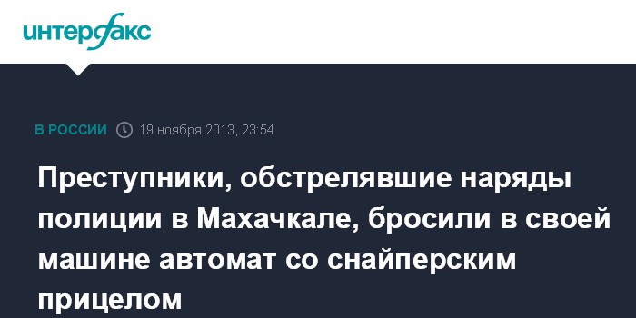 Махачкала. 19 ноября. INTERFAX.RU - Среди преступников, блокированных на улице Рахматуллаева в Махачкале (Дагестан), может находиться снайпер, совершивший серию нападений на полицейских. Как сообщили "Интерфаксу" в правоохранительных органах Дагестана, автомат со снайперским прицелом найден в брошенной преступниками машине.