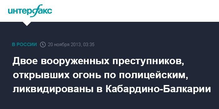 Пятигорск. 20 ноября. ИНТЕРФАКС-ЮГ - Полицейские в результате столкновения уничтожили двух вооруженных преступников в Баксанском районе Кабардино-Балкарии, их личности устанавливаются, сообщили агентству "Интерфакс-Юг" в МВД по КБР.