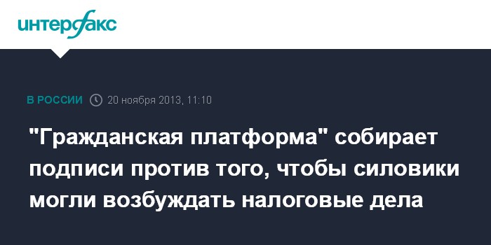 Москва. 20 ноября. INTERFAX.RU - Партия "Гражданская платформа" начинает сбор подписей против законодательной инициативы, позволяющей силовикам возбуждать дела по налоговым преступлениям без претензий ФНС.