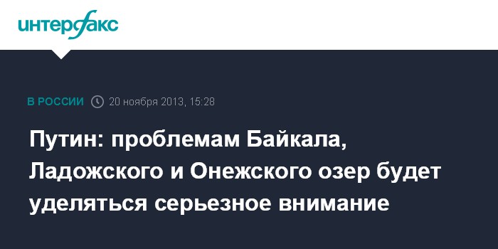 Москва. 20 ноября. INTERFAX.RU - Государство намерено уделить серьезное внимание восстановлению озера Байкал, а также Ладожского и Онежского озер, заявил президент России Владимир Путин.