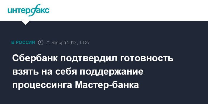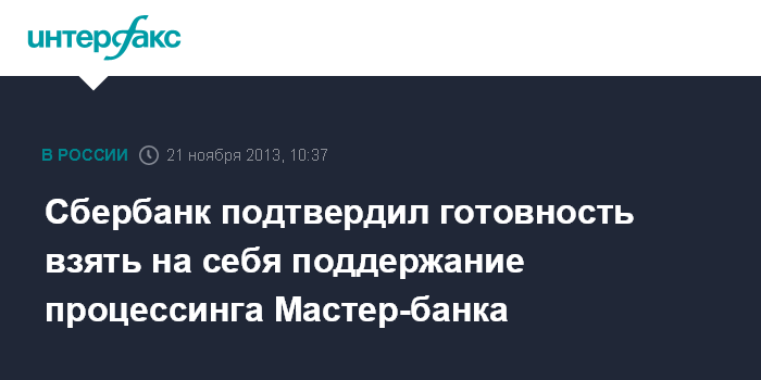 Москва. 21 ноября. INTERFAX.RU - Сбербанк России подтвердил готовность поддержать процессинг Мастер-банка, отзыв лицензии у которого лишил клиентов десятков небольших кредитных учреждений возможности совершать операции по своим картам.