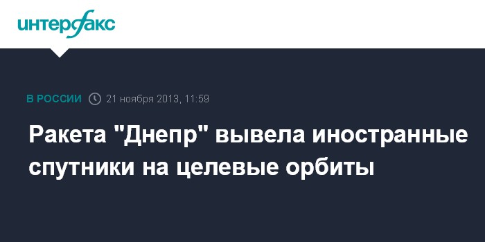 Ясный (Оренбургская область). 21 ноября. INTERFAX.RU - Ракета-носитель "Днепр", созданная на базе тяжелой межконтинентальной баллистической ракеты (МБР) РС-20 "Воевода" (по классификации НАТО SS-18, "Сатана"), вывела на околоземные орбиты несколько зарубежных космических аппаратов различного назначения.