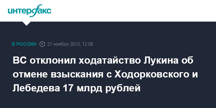 Москва. 21 ноября. INTERFAX.RU - Верховный суд РФ отклонил требование уполномоченного по правам человека в РФ Владимира Лукина отменить взыскание с бывших руководителей НК ЮКОС Михаила Ходорковского и Платона Лебедева 17 млрд рублей по первому приговору в части гражданского иска.