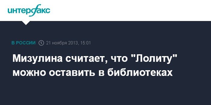 Москва. 21 ноября. INTERFAX.RU - Глава комитета Госдумы по вопросам семьи, женщин и детей Елена Мизулина считает избыточной мерой изъятие романа "Лолита" Владимира Набокова из школьных библиотек.