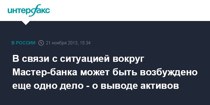 Москва. 21 ноября. INTERFAX.RU - Уголовное дело о выводе активов может быть возбуждено в связи с ситуацией, сложившейся в Мастер-банке, сообщил "Интерфаксу" в четверг источник в правоохранительных органах.