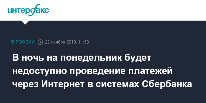 22 ноября. INTERFAX.RU - Сбербанк 25 ноября 2013 г. в период с 0:00 до 4:55 мск проведет технологические работы в процессинговом центре.