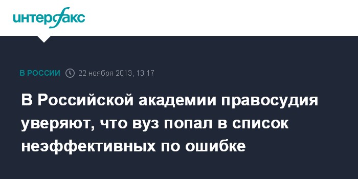 Москва. 22 ноября. INTERFAX.RU - Российская академия правосудия попала в список вузов, имеющих признак неэффективности, из-за технической ошибки при составлении отчета в ходе мониторинга высших учебных заведений этого года, утверждают в академии.
