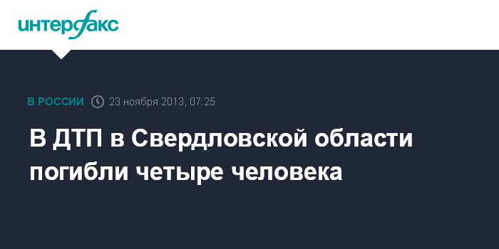 "В 05:20 мск в Свердловской области на 300 км автодороги "Пермь-Екатеринбург" произошло столкновение легкового и грузового автомобилей. Погибли четыре человека", - говорится в сообщении.