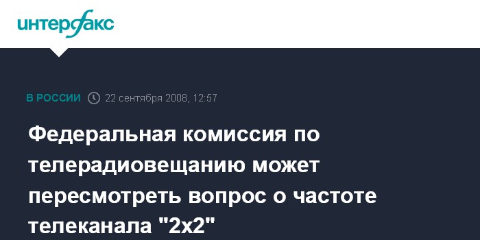 Москва. 22 сентября. INTERFAX.RU - Федеральная конкурсная комиссия по телерадиовещанию (ФКК) в среду, возможно, рассмотрит вопрос о частоте телеканала "2х2", который в последнее время был в центре внимания из-за демонстрации скандальных мультфильмов.