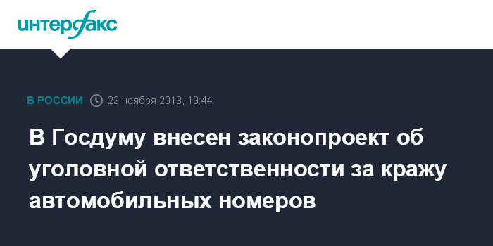 Москва. 23 ноября. INTERFAX.RU - Законодательное собрание Санкт-Петербурга внесло в Госдуму законопроект, предусматривающий лишение свободы до двух лет или штраф до 200 тысяч рублей за кражу автомобильных номеров.