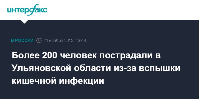 Ульяновск. 24 ноября. INTERFAX.RU - В г. Инза (Ульяновская область) к утру воскресенья из-за вспышки кишечной за медицинской помощью обратилось уже 224 человека, большинство из них - дети, сообщили агентству "Интерфакс-Поволжье" в Главном управлении МЧС России по региону.