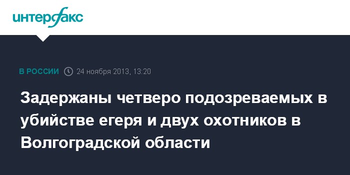 Волгоград. 24 ноября. INTERFAX.RU - В Волгоградской области задержаны четверо подозреваемых в убийстве егеря и двух охотников из Москвы и Тамбовской области, сообщила агентству "Интерфакс-Юг" официальный представитель ГУ МВД Светлана Смольянинова в воскресенье. "Задержаны четверо человек, в их числа одна женщина, а также Агеев Александр 1960 года рождения, который 13 лет находился в федеральном розыске за разбой", - сказала С.Смольянинова.