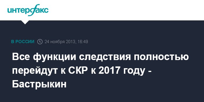 Как сообщает сайт СКР в воскресенье, А.Бастрыкин, отвечая на вопрос о том, что реформа в России пока не решила проблемы самостоятельности следствия, поскольку следственные функции остаются у МВД и ФСБ, признал ее существование, но подчеркнул, что все функции следствия должны быть переданы СК к 2017 году.