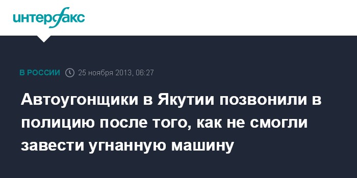 Якутск. 25 ноября. ИНТЕРФАКС-ДАЛЬНИЙ ВОСТОК - Автоугонщики в Якутии сами позвонили в полицию после угона автомобиля, сообщает пресс-служба МВД республики в понедельник.