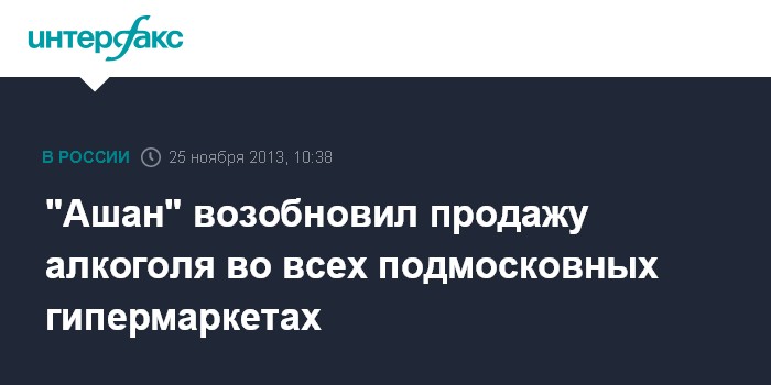 Москва. 25 ноября. INTERFAX.RU - Французский ритейлер Auchan возобновил продажу алкоголя во всех гипермаркетах в Московской области, сообщила "Интерфаксу" представитель компании "Ашан Россия" Мария Курносова.
