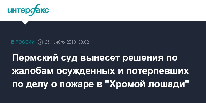 Пермь. 26 ноября. INTERFAX.RU - Пермский краевой суд во вторник огласит решение по апелляционным жалобам, поданным в связи с приговором по делу о пожаре в клубе "Хромая лошадь".