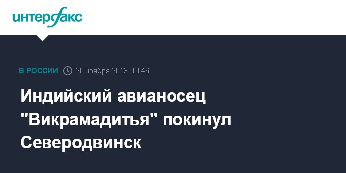 Северодвинск. 26 ноября. INTERFAX.RU - Авианосец "Викрамадитья" (бывший "Адмирал Горшков"), завершивший модернизацию на северодвинском предприятии "Севмаш" и переданный 16 ноября в состав ВМС Индии, во вторник покинул завод для подготовки к переходу к месту базирования, сообщила "Интерфаксу-АВН" руководитель пресс-службы предприятия Екатерина Пиликина.