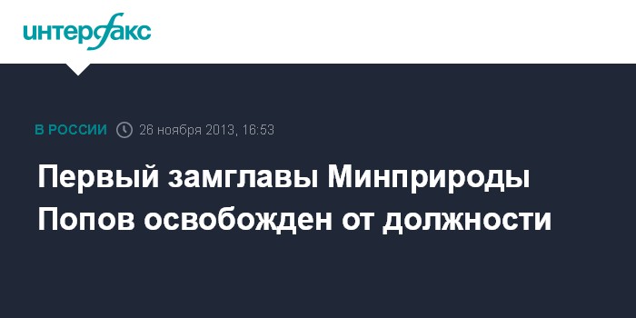 Москва. 26 ноября. INTERFAX.RU - Председатель правительства РФ Дмитрий Медведев подписал распоряжение об освобождении Николая Попова от должности статс-секретаря - первого заместителя министра природных ресурсов и экологии.