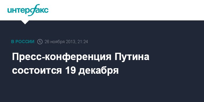 Москва. 26 ноября. INTERFAX.RU - Пресс-конференция президента России Владимира Путина пройдет 19 декабря 2013 г. в 12:00, сообщила пресс-служба Кремля.