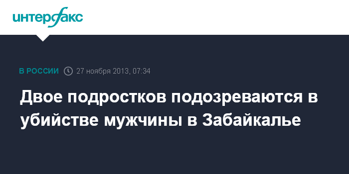 Чита. 27 ноября. ИНТЕРФАКС-СИБИРЬ - В Ононском районе Забайкальского края возбуждено уголовное дело в отношении двух подростков, подозреваемых в убийстве мужчины, сообщает пресс-служба краевой прокуратуры.