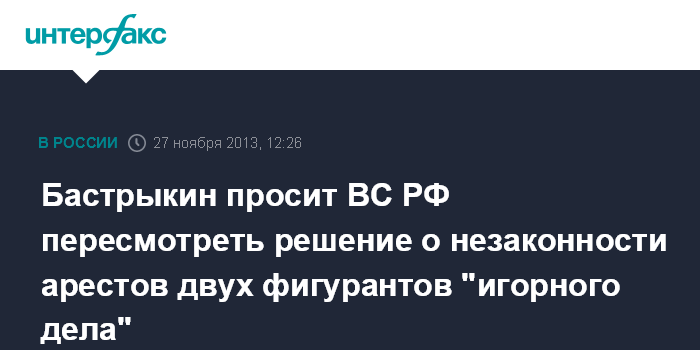 Москва. 27 ноября. INTERFAX.RU - Председатель Следственного комитета РФ Александр Бастрыкин обратился в Верховный суд России с требованием пересмотреть решение о незаконности арестов двух фигурантов "игорного дела", сообщает на сайте ВС РФ.