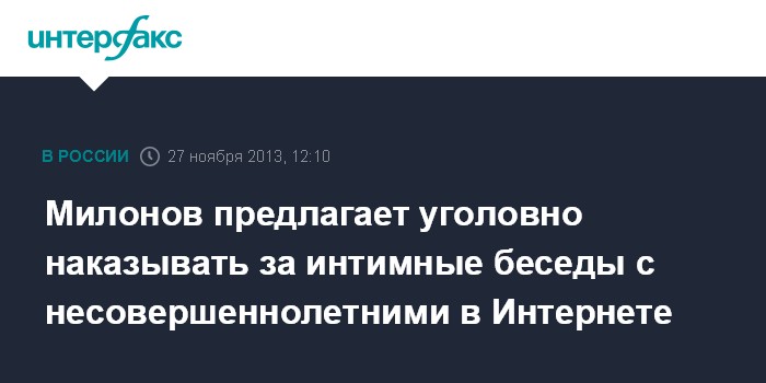 Санкт-Петербург. 27 ноября. INTERFAX.RU - Депутат Законодательного собрания Санкт-Петербурга Виталий Милонов предложил ввести в России уголовную ответственность для людей, которые знакомятся с несовершеннолетними в интернете и склоняют их к интимным встречам.