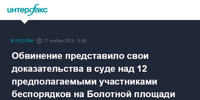 Москва. 27 ноября. INTERFAX.RU - Сторона обвинения закончила представлять доказательства в Замоскворецком суде Москвы по уголовному делу в отношении 12 предполагаемых участников массовых беспорядков на Болотной площади в мае прошлого года.