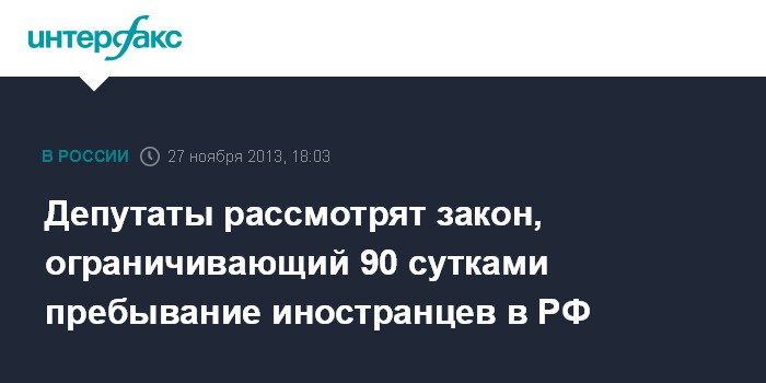 Москва. 27 ноября. INTERFAX.RU - В Госдуму РФ внесен законопроект, предлагающий ограничить пребывание всех иностранных граждан в России до 90 суток в течение полугода.
