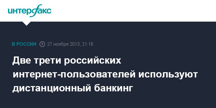 Москва. 27 ноября. INTERFAX.RU - Более двух третей (68,7%) пользователей Интернета (19,4 млн человек из расчета 28,3 млн суточной аудитории Интернета) в России используют хотя бы один из сервисов дистанционного банковского обслуживания (ДБО): интернет-банк, мобильный банк или SMS-банк, говорится в исследовании e-Finance User Index 2014 агентства Markswebb Rank & Report, основанном на данных опроса интернет-пользователей.