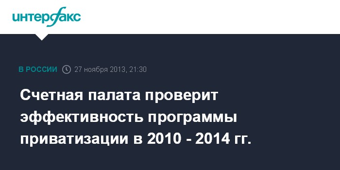 Москва. 27 ноября. INTERFAX.RU - Счетная палата (СП) России по предложению депутатов проверит эффективность программы приватизации с 2010 по 2014 год, сообщила глава контрольного органа Татьяна Голикова, выступая в эфире телеканала "Россия 24".