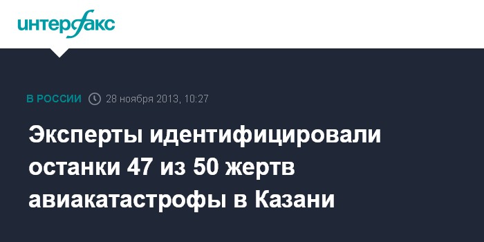 "На сегодняшний день идентифицированы останки 47 погибших, работа по идентификации продолжается как в Казани, так и в Москве, куда доставлена часть останков для ускорения процедур", - сообщили "Интерфаксу" в республиканском бюро судмедэкспертизы минздрава Татарстана.