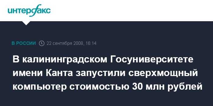 Москва. 22 сентября. INTERFAX.RU - В Калининграде в Российском Государственном университете имени Канта (РГУК) прошел торжественный запуск сверхмощного компьютера стоимостью 30 млн рублей, сообщили "Интерфаксу" в информационном управлении ВУЗа.