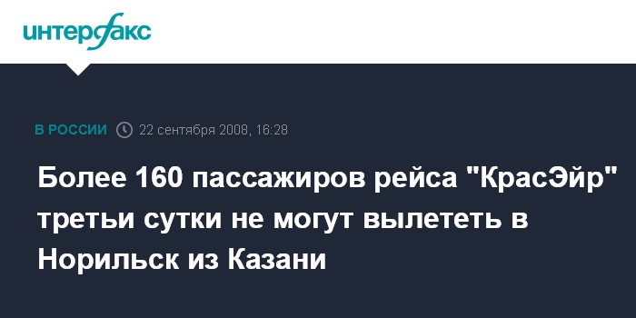 Москва. 22 сентября. INTERFAX.Ru - В международном аэропорту "Казань" (Татарстан) с минувшей субботы находятся пассажиры рейса N432 "Краснодар-Норильск" авиакомпании "КрасЭйр" (входит в альянс AirUnion), вылет которого откладывается уже третьи сутки.