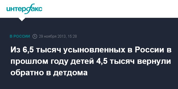 "В последние годы брать в семьи детей-сирот стали в России наполовину меньше, а если речь идет об усыновлении, то из 6 тыс. 500 усыновленных по стране в прошлом году детей 4 тыс. 500 были возвращены обратно в детдома", - сказала член комитета Совета Федерации ФС РФ по социальной политике Валентина Петренко в ходе совещания в Ростове-на-Дону.