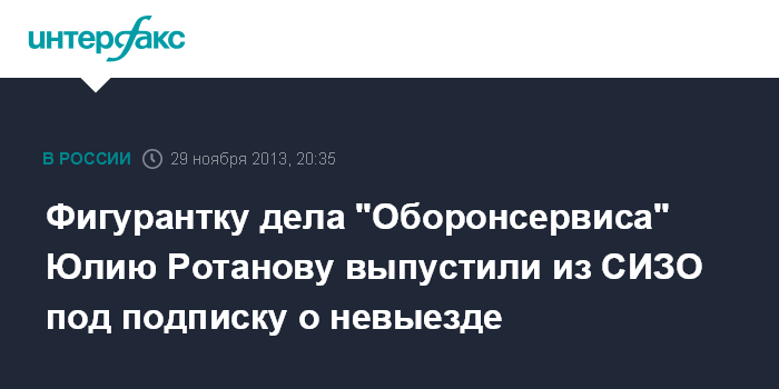Москва. 29 ноября. INTERFAX.RU - Фигурантка дела "Оборонсервиса" Юлия Ротанова отпущена из СИЗО, сообщил "Интерфаксу" в пятницу ее адвокат Андрей Боровков.