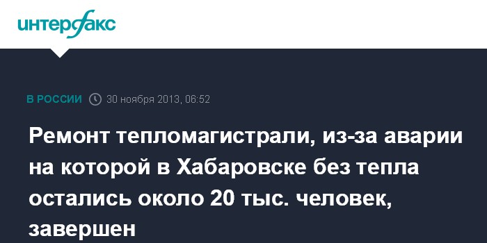 Хабаровск. 30 ноября. ИНТЕРФАКС - ДАЛЬНИЙ ВОСТОК - В Хабаровске рано утром в субботу восстановлено теплоснабжение 74 жилых домов и 9 соцобъектов, которые остались без тепла из-за аварии на тепломагистрали в Индустриальном районе города.