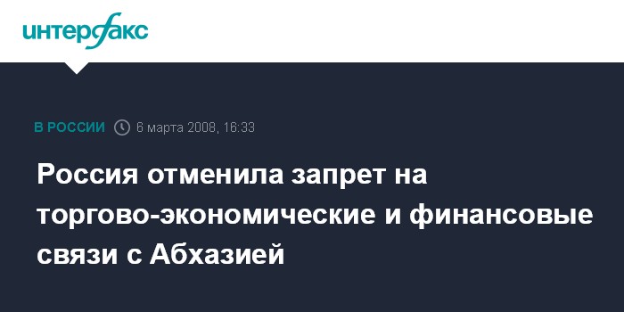Москва. 6 марта. INTERFAX.RU - Россия выходит из режима запрета на осуществление торгово-экономических, финансовых, транспортных и иных связей с Абхазией по государственной линии, сообщил МИД РФ.