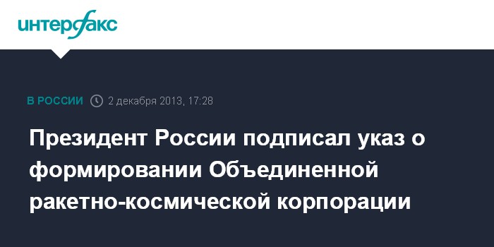 Москва. 2 декабря. INTERFAX.RU - Указ о формировании ОАО "Объединенная ракетно-космическая корпорация" на базе НИИ космического приборостроения и передачи в его собственность акций ряда космических предприятий подписал президент России Владимир Путин, говорится в тексте указа, опубликованного в понедельник на официальном портале правовой информации.