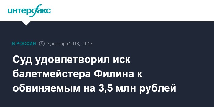 Москва. 3 декабря. INTERFAX.RU - Мещанский суд Москвы удовлетворил гражданский иск художественного руководителя балета Большого театра Сергея Филина и взыскал в его пользу с обвиняемых в нападении 3,5 млн рублей, передает корреспондент "Интерфакса".