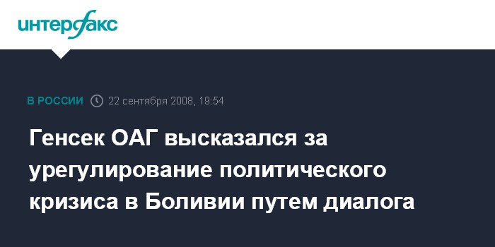 Москва. 22 сентября. INTERFAX.RU - Политический кризис в Боливии должен быть разрешен путем диалога, заявил генеральный секретарь Организации американских государств (ОАГ) Хосе Мигель Инсульса, находящийся в Боливии с посреднической миссией.