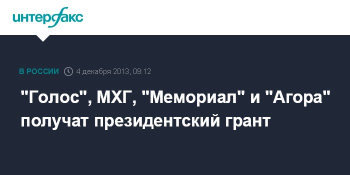 Кроме того, добавляет газета, без грантов не остались Московская Хельсинкская группа (МХГ), центр "Мемориал" и ассоциация "Агора", для которых это будут вторые президентские гранты за год.