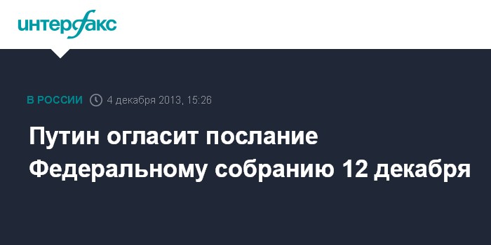 Москва. 4 декабря. INTERFAX.RU - Президент РФ Владимир Путин обратится с ежегодным посланием к Федеральному собранию 12 декабря в Кремле, сообщается на сайте президента.